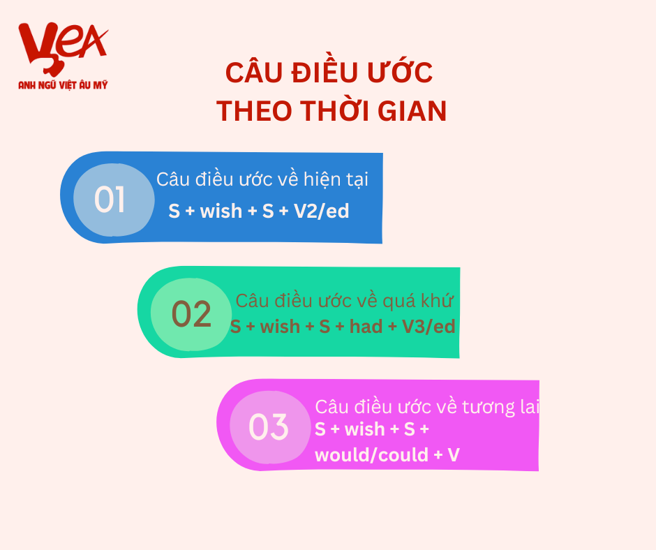 Câu điều ước được chia thành ba loại chính: câu điều ước về hiện tại, câu điều ước về quá khứ và câu điều ước về tương lai.