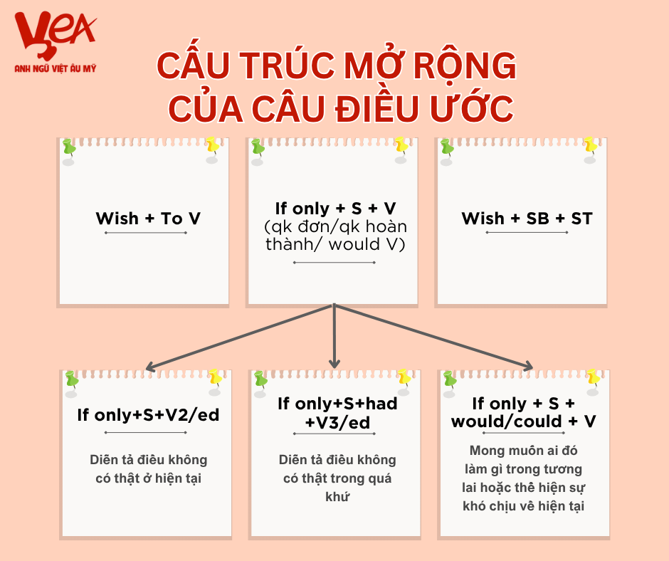 Bên cạnh ba dạng chính là câu điều ước ở hiện tại, quá khứ và tương lai, tiếng Anh còn có một số cấu trúc mở rộng giúp diễn đạt mong muốn, nuối tiếc hoặc lời chúc trong những tình huống cụ thể.